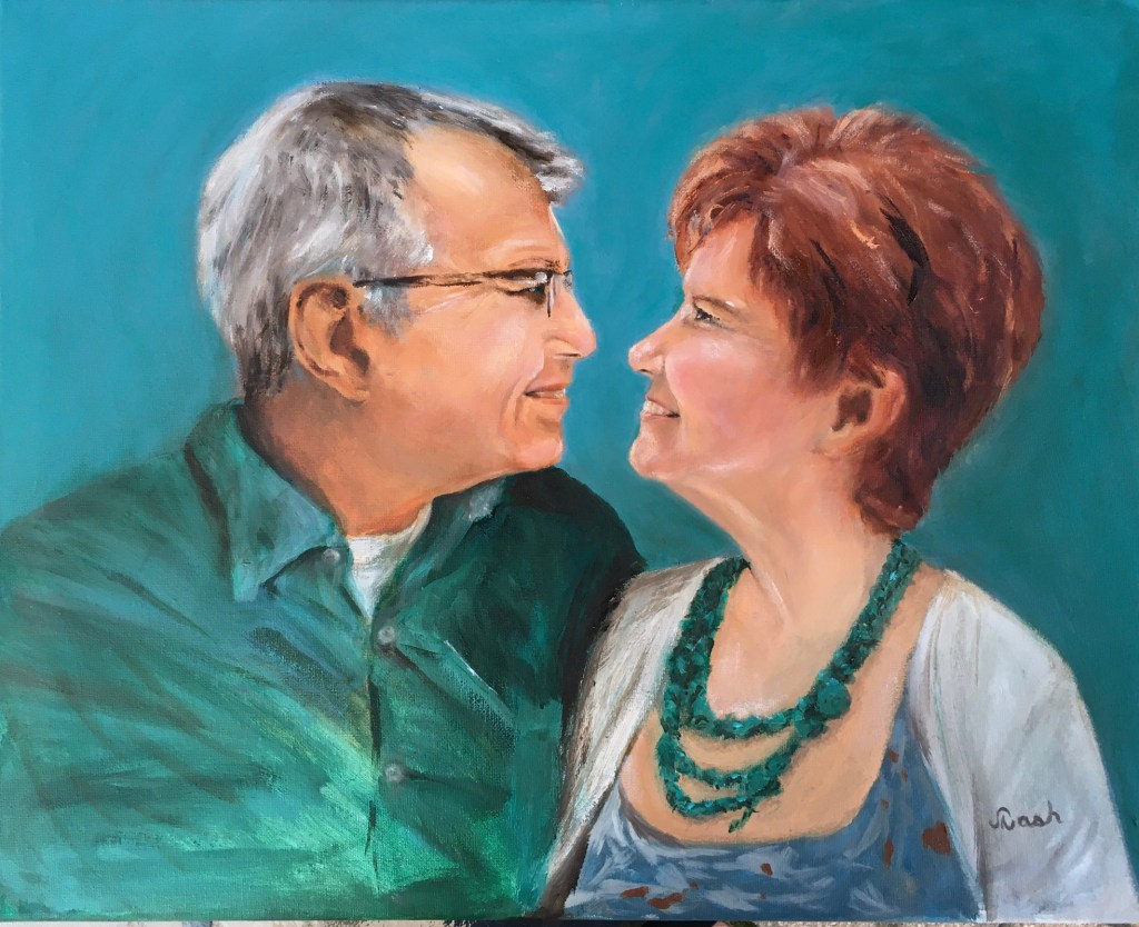 They were delighted with the way it turned out, and so am I. They are a beautiful couple and I enjoyed painting them. I worked from several photos which I took both at the retirement party and later at my home.