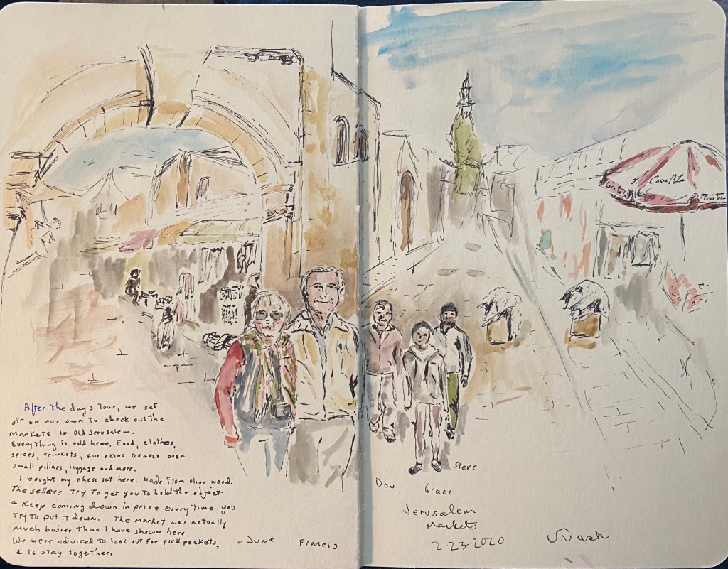 Our tour bus got back early so we decided to explore. Don and Steve were here before so they knew where to go. The shops lines both sides of narrow streets. This sketch is at an entrance from one section of the market to another.