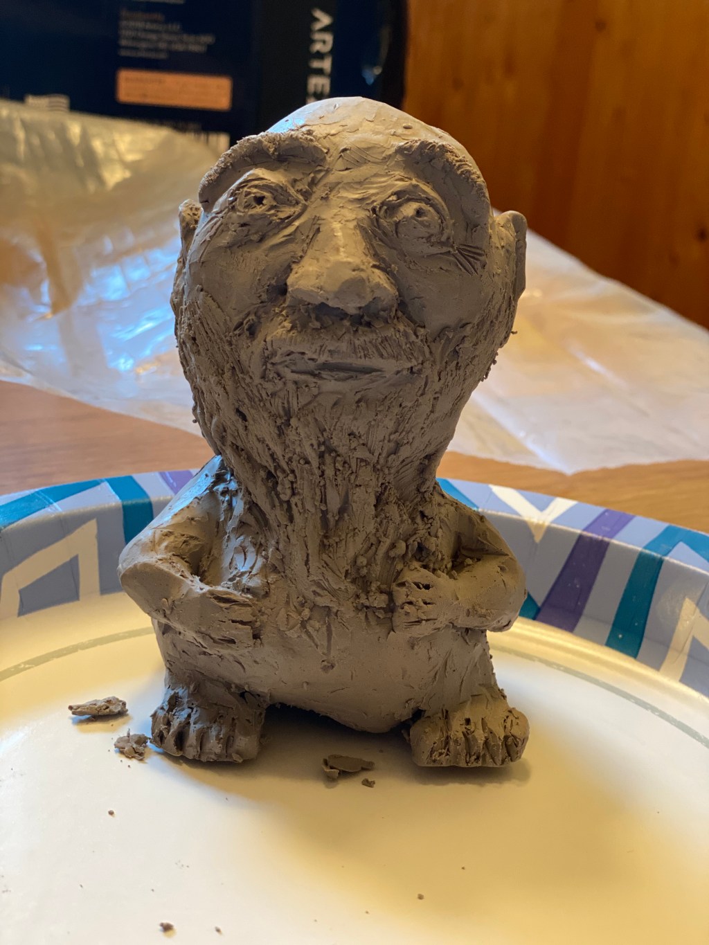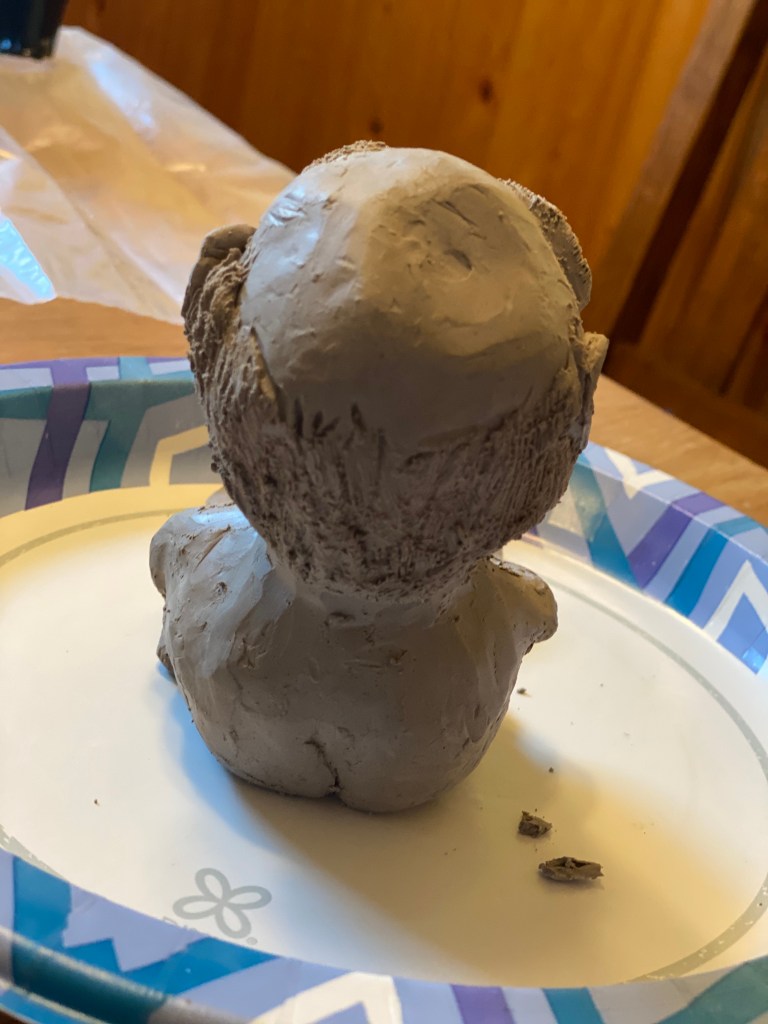 This Gnome isn’t finished, though he does have a name. I named him Clayton, because he is made of clay. I put him in a plastic bag to keep him from drying out. That way, I can make a few adjustments if I feel the need after letting him sit overnight. Once I’m happy with how he looks, I will paint him. When he is dry, he will be white and I think he’ll look nice with some color.