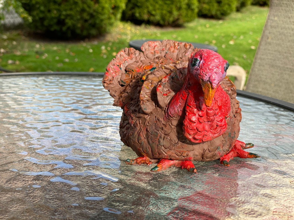 Or should I say Sculpting Turkey. Since Thanksgiving is coming soon, I decided to create a Turkey in Air Dry Clay. I painted it while it was still wet. He is sitting on my coffee table. I will let him sit about a week to make sure he is nice and dry before I put a clear coat on him.