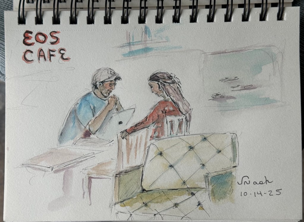 In the afternoon, I went to Eos Cafe to do some more urban sketching with the Lakeside Palette Club. This couple seemed to be enjoying themselves as much as I enjoyed sketching them.